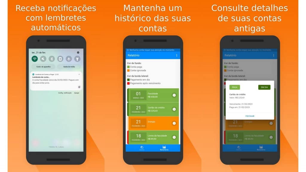 Outras características denotam seu ponto forte, como a possibilidade de cadastrar quantas contas desejar, a inserção de datas fixas ou variáveis, manter um histórico e controle de todas as contas geradas, etc.