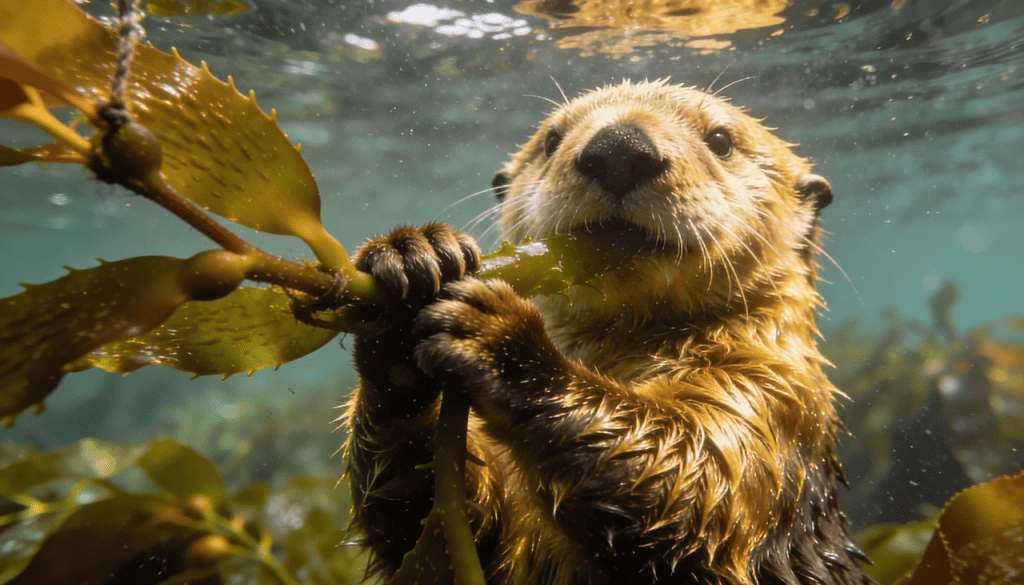 Lontras se enrolam em algas para não serem levadas pelas correntes – (Imagem gerada por inteligência artificial-ChatGPT/Olhar Digital)