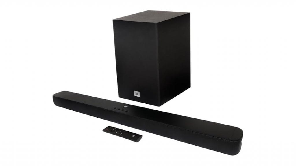 A JBL Cinema SB180 é uma soundbar de 2.1 canais formada por uma barra frontal e um subwoofer sem fio. A barra concentra os alto-falantes principais, responsáveis por dialogar com a TV e distribuir as frequências médias e agudas. Já o subwoofer de 6,5 polegadas fica separado, cuidando dos graves e adicionando peso ao áudio geral.