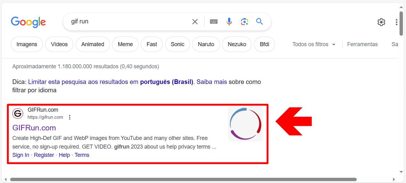 Clique na barra de busca do seu navegador e inicie uma pesquisa por “Gif Run” no Google. Uma vez que o resultado aparecer, clique no primeiro link disponível;