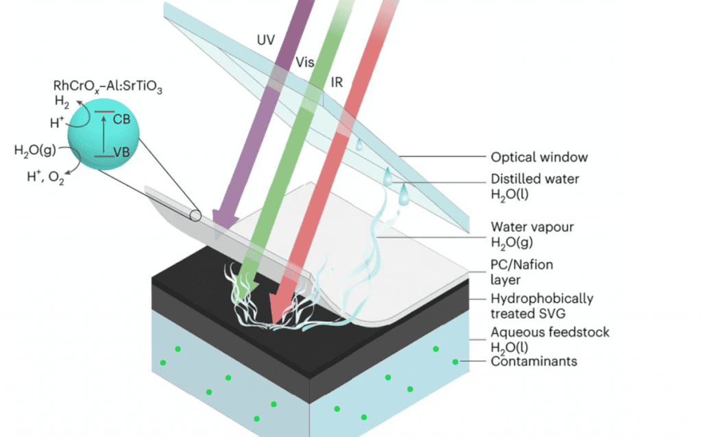 O dispositivo imita a transpiração das plantas, usando uma camada que absorve UV para produzir hidrogênio através da divisão da água, enquanto o restante da luz do espectro solar aquece o dispositivo, vaporizando a água.