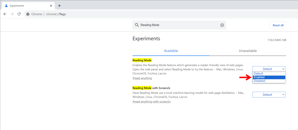 Para ativar a nova barra de ferramentas, digite o comando ‘chrome://flags’ na barra de endereço do browser.Em seguida, pesquise pela opção “Reading Mode” na barra de busca.Por fim, clique em ‘Enabled’ como mostra a captura de tela abaixo e reinicie o navegador.