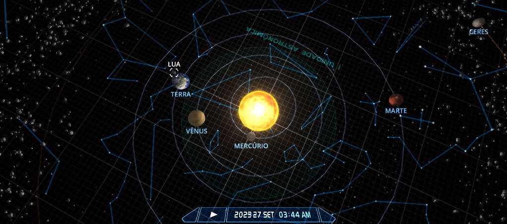 Configuração do sistema solar no exato momento em que a Lua atinge o ponto mais distante do Sol nesta quarta-feira (27). Crédito: SolarSystemScope