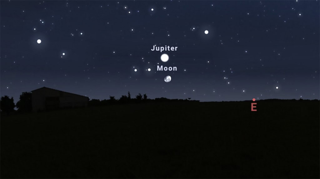 Segundo o guia de observação espacial InTheSky.org, isso acontece às 12h47 (pelo horário de Brasília), quando a Lua estará a pouco mais de 3º de distância de Júpiter na paisagem celeste. Para se ter uma ideia, se você estender o braço com a mão fechada em direção ao céu, o punho cobre cerca de 10º. Então, Lua e Júpiter estarão a menos da metade dessa largura um do outro.
