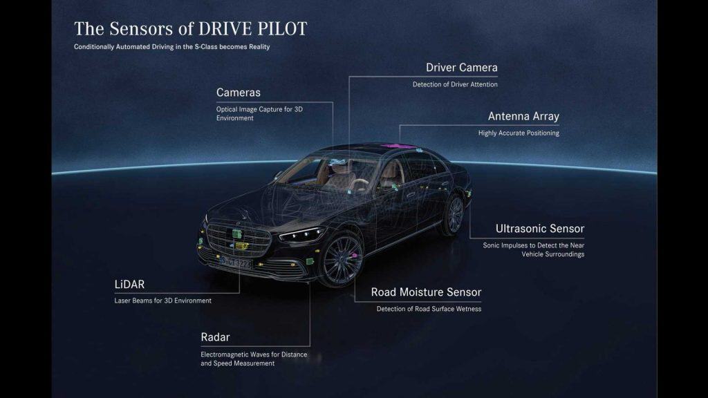 O Drive Pilot é acionado por um botão no volante e funciona aliado a uma variedade de sensores no carro, como câmeras, radares, GPS, reconhecimento ultrassônico e mais.Por segurança, a Mercedes adicionou alguns limites. Em tráfego pesado, por exemplo, o recurso é acionado apenas em estradas bem mapeadas e se as condições do tempo estiverem favoráveis.Além disso, o software pode solicitar que o motorista assuma o volante a qualquer momento, alerta a empresa.