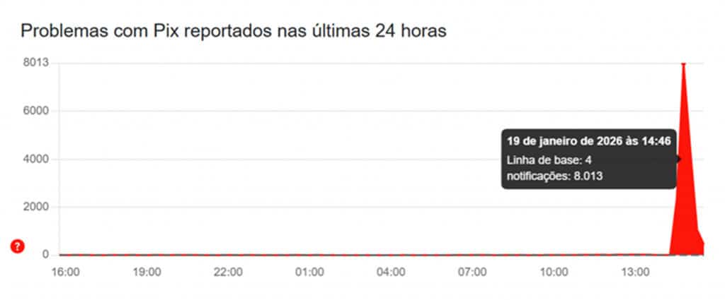 O Downdetector, site que monitora aplicativos e plataformas online, registrou um aumento no número de reclamações por volta das 14h (horário de Brasília). O pico aconteceu às 14h46, com mais de 8 mil registros de falhas.