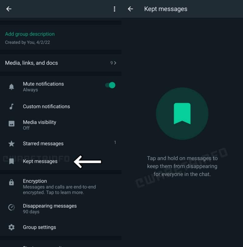 Chamado de “Kept messages”, a nova seção aparece no menu de informações do grupo, como mostra a primeira captura de tela abaixo.Segundo as instruções, ao manter o dedo pressionado sobre uma mensagem temporária, ela vai para a lista do “Kept messages” e não desaparece mais, mesmo após o prazo de vencimento.Na segunda janela, todas as mensagens selecionadas ficarão salvas.